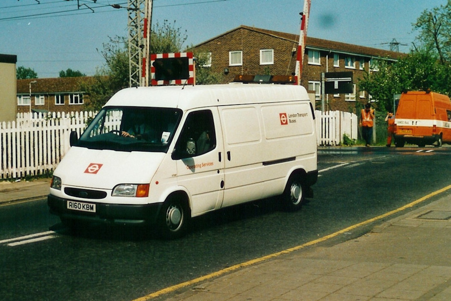 Details: London Transport Buses received three batches of Ford Transit vans in the second half of the 1990s, though all of the first batch had been withdrawn in 1999. Representing the third batch, new in late 1997, is 4799F, caught coming off the level crossing at Enfield Lock station on 6th May 2000. The location would suggest that this van was based at Turnpike Lane, but allocation information from this period is a bit patchy. Up to the late 1990s, allocations were included in official lists which were made available. For later periods, we are reliant on reported observations. 4799F appeared on one official list but, as with most of the LTB vehicles, the allocation was given as the generic 'Buckingham Palace Road' (i.e. Victoria Coach Station). Unfortunately, only two sightings of 4799F have been added, neither of which gave the location. In the background of this photo is another Mk5 Transit, this being a high-roof crew van in the orange and white livery of AMEC Rail. This was one of several companies to be awarded contracts for infrastructure maintenance on the national rail network. In fact I was employed by AMEC Rail for a time in 1998/1999, based in their Wimbledon office. |