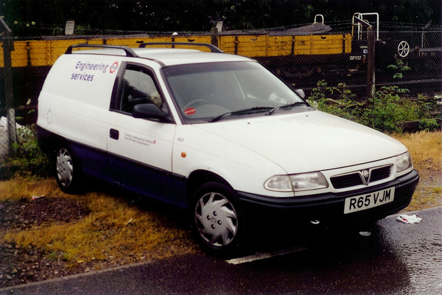 Details: From the mid-1980s until the early 2010s, the Bedford/Vauxhall Astra van was a common feature of the central fleet, over 270 being used. This compares to nearly 600 examples of the broadly similar Ford Escort van, though production of the latter had started over ten years earlier. As at April 2000, there were 14 Astra vans in use, alongside 42 of the Escort van. Although the Astras were all badged as Vauxhalls, the vans carried a mixture of B and V fleetnumber suffixes. 4821, seen here, avoided the confusion by omitting the suffix altogether. New in June 1998 this was a petrol-engined 1.6LS 2+2 van. The 2+2 designation usually referred to the fitting of a second row of seats, although since such vans had no additional doors or windows, it was almost impossible to confirm their interiors from photographs. 4821 had 'Engineering services' lettering, with department lettering that appears to read 'Civil & Track Consultancy', curiously using title case rather than sentence case. No allocation information is available and the location and date of this photo are not confirmed but could well be Chalfont and Latimer Station on 16th June 2001. The van was withdrawn in October 2001, while production of van Astras ended in 2013. Also visible in this photo are LUL wagons GP937 (General Purpose, built by Procor in 1985) and what looks to be FW351 (Flat Wagon, Gloucester 1951). The latter was officially numbered F351 and, despite its age, remained in stock to at least 2013. |