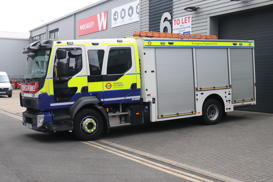 Details: On 11th June 2020, Derek paid a visit to the Emergency Response Unit depot in Battersea and found Volvo tender 2604 parked outside. I am adding photos of both sides of this vehicle, as there is something of interest in each view. Well, I think they are interesting... Perhaps the most significant point to note is the 'To Let' sign in the background. This is clearly related to Unit 6, which is where the ERU base is. Presumably there are plans to move the vehicles elsewhere in the near future. As for the vehicle, this nearside view shows the arrangement of the crew cab. As seems to be normal with modern lorries, the crew cab is designed to make use of the same basic door parts for both the front and rear sections. This explains the raked-back leading edge to the second door (and the resultant odd shape of the infill window), the black moulding panel below the window (where the mirrors would be attached) and the cut-out at the rear of the lower edge (to clear the wheelarch). I feel that the appearance could be greatly improved if the rear compartment could use a different door design. Having said all that, the two doors on this side are obviously different, the forward one having an additional 'kerb' window. Something I had not noticed before was that the Volvo FL model features these windows on the nearside but not on the offside. Another item that I have only just noticed is the way the space within the main bodywork is used to the fullest. As well as the three main compartments (each with a roller shutter door), there are smaller cubbyholes around the wheelarch and up the front end. |