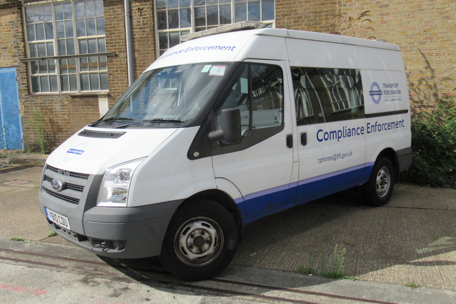 Details: Following the departure of the cleaning van (6527F) and the last of the old facilities vans (6517F) in the first half of 2020, just one vehicle from the 6xxx fleetnumber range remained. Unfortunately it is one that does not actually carry its number! 6987F was an Ashwoods hybrid conversion of a Ford Transit crew van, delivered in overall white in July 2010 for the part of TfL that took over the role of the Public Carriage Office. In about 2016 the livery was changed to the new variant for this department, comprising a blue skirt topped with a lilac stripe. Being a little over ten years old, it was no doubt awaiting disposal when seen at Acton Works on 22nd August 2020, this view being the first photo to clearly show its 'new' livery. What replaced this van is not yet known, although Ford Transit crew van 8863F is reported to be in a similar TfL livery. |