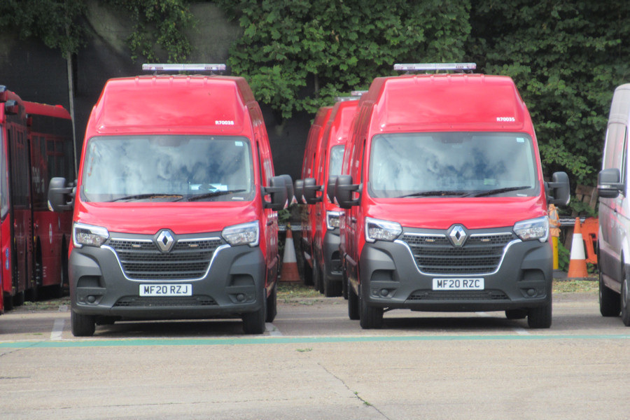 Details: The new Renault Master vans delivered to RATP-Dev's Hounslow Heath Garage on the last day of July 2020 were still present over three weeks later on 22nd August. Interestingly they had now gained fleetnumbers, although only those parked at the front of each line could be seen. Based on these, it looks as though the batch has been numbered as R70030 to R70041 in registration number order. Just visible on the right is Volkswagen Crafter van EK19SVZ in plain white. This was also here three weeks earlier and hence could probably be added as an RATP vehicle. Given that it might be a hire and due for replacement by the new Renaults, I will hold fire unless any further sightings are reported. |