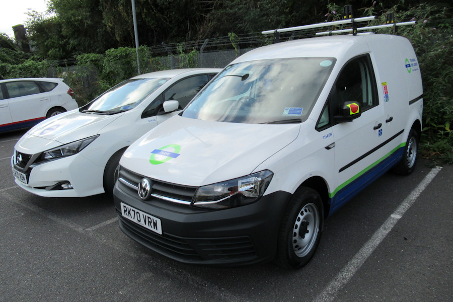 Details: Illustrated at Bedfont last month, Volkswagen Caddy van RK70VRW had made it to Acton Works and been given Trams livery by September 12th 2020 (when it was photographed in the car park). It replaced Renault Kangoo Maxi van 8173R, which was seen in the same location a week later. Also visible are TfL Nissan Leaf car 9102N (soon dispatched to Turnpike Lane) and LUL Toyota Prius+ car 8692T from Wembley Park (which was parked here from at least mid-August). |