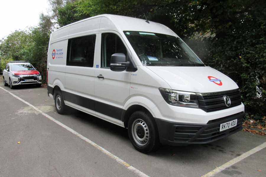 Details: Several VW Crafter crew vans were noted at the Bedfont dealership in mid-October 2020 and although they were in unmarked white, it was thought that they might be destined to be service vehicles. This theory was proved when Ray visited Acton Works on 24th October and found no fewer than six of them awaiting entry to service. As with the Crafter vans delivered to Hainault the preceding week, the new crew vans were finished in plain white but with full lettering. This photo shows 9144VW parked on the stub road in the works. The lettering below the fleetnumber reads DuoVan, this presumably being Volkswagen's take on the 'Kombi' branding often applied to vans that combine cargo space with additional seating. Further up the slope was a recently delivered Mitsubishi Outlander electric car, DY70SKZ. This was in unmarked white/blue but had a red bonnet and a light-bar, suggesting it may be for use by the Emergency Response Unit. The ERU has had a car in its fleet for many years but, since the departure of Volvo estate LM66UNH in early-2020 they have been making use of a standard-liveried Toyota Prius car. |