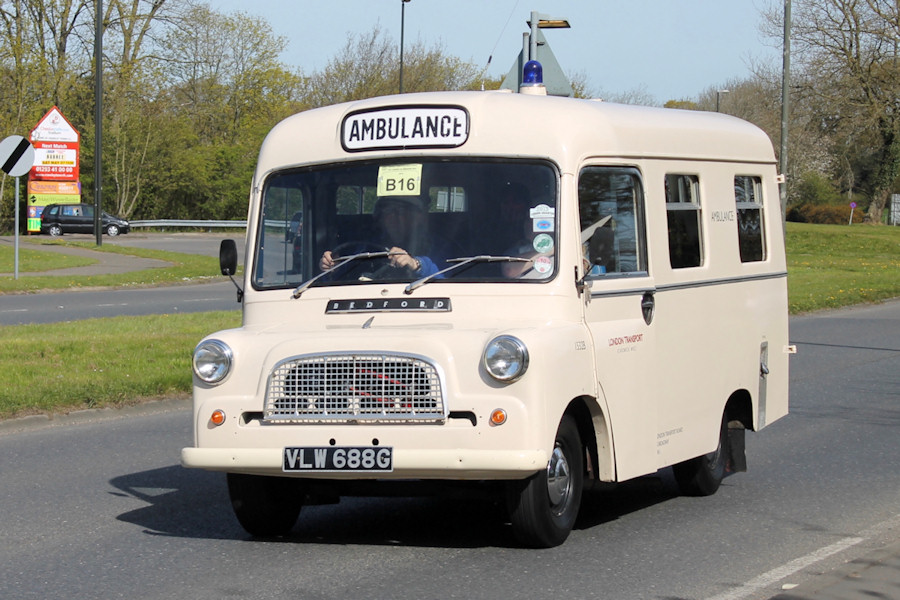 Details: Another excellent photo of a preserved service vehicle, this being Bedford CALV ambulance 1532B. It was caught passing through Crawley on the 1st of May 2016 while taking part in the HCVS London to Brighton run. 1532B was one of two ambulances owned by London Transport for use at their largest works, Aldenham and Chiswick, with 1532B being based at the latter. It was withdrawn with the run-down of Chiswick Works in the mid-1980s and was sold in 1985. Not seen for many years, it returned in fully restored condition in 2013 (as seen at Brooklands). I have always listed these two ambulances as having been in a white livery, though it looks distinctly cream in this photo, and is recorded as such by the DVLA. Compared to when it was in service, the wing mirrors have been moved from the bonnet to the windscreen pillars, and the beading low down on the nearside (visible here and possibly a repair job) has been replaced with plain panelling.