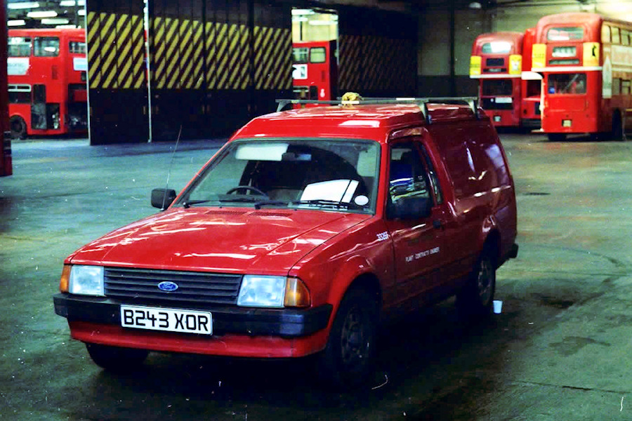 Details: By the time Ford Escort vans 3326F and 3327F were delivered in July 1985, London Transport had already made use of nearly 300 of the type (not all at the same time). This pair were for use by the Plant Manager (Buses) and official documents showed that they were 'additional', indicating that they were not leased to replace any existing vehicles. Based at Chiswick Works their role took them to various bus garages and 3326F was photographed inside Enfield Garage in September 1987. This was the month in which Enfield lost its last conductors and Routemaster buses, with the conversion of route 279 to OPO (one person operation). For at least the next six years, Enfield's scheduled allocation was made up entirely of M-class MCW Metrobuses, with none of the early mini- and midi-buses being based here. A handful of Routemaster and Daimler Fleetline buses were retained for use as trainers, some of which can be seen in the background of this photo. The Routemaster on the left is a trainer (recognisable by the black panel on the rear) as is the Fleetline in Leaside livery alongside. |