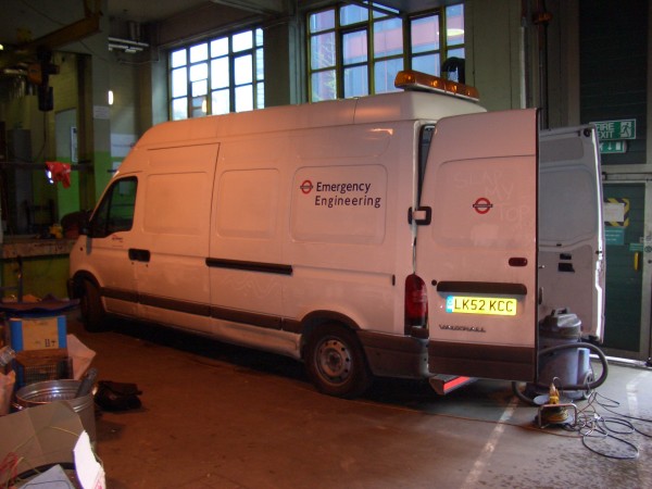 Details: Lurking inside Griffith House with MAN 2579 on April 25th 2004 was 5438V (LK52KCC), a Vauxhall Movano 2.5 DTI high-roof van. As can be seen, it carries all-over white livery, with Underground Emergency and Metronet markings but no fleetnumber. |