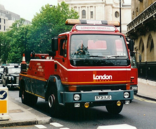 Details: Bus recovery trucks were often given special treatment in terms of livery and fittings. Typical of this is London General Leyland Freighter 2415L (B731XJD) photographed in Westminster on 9th September 1996. Compared to earlier in its career, it has received a modified version of the bus livery, and has also been fitted with a new light bar and fog lights. |