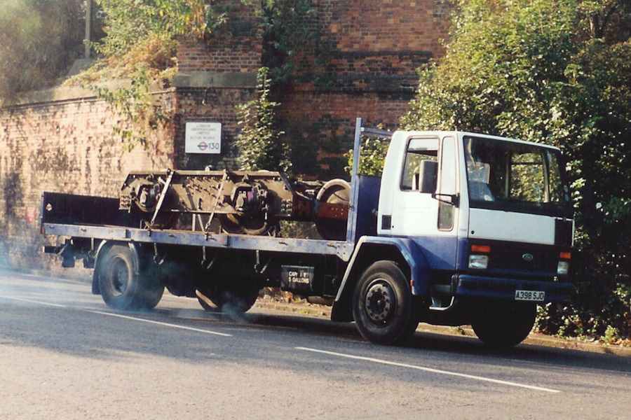 Details: Another view of Ford Cargo lorry 2398F in white/blue livery, this one taken on Bollo Lane (Acton) some time after the Hounslow photo. The dropside doors have been removed, converting the lorry to a flatbed, while the non-standard white fleetnumbers have been replaced with normal ones on the front corner panels. |