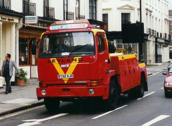 Details: Shortly after taking over the Leaside and South London bus companies, Cowie introduced a livery which added two yellow stripes to the basic red livery of its inherited buses. This was not particularly attractive, nor was the variant livery applied to Leaside Leyland Freighter Bus Recovery Truck 2416L (B732XJD)! Apart from the yellow stripes, everything else -including the bumper, mudguards and steps- has been liberally coated in red, similar to the treatment given to 1283F much earlier. The ARRIVA(L) of a subsequent corporate era hopefully resulted in a further repaint! Victoria, 21st May 1997. |