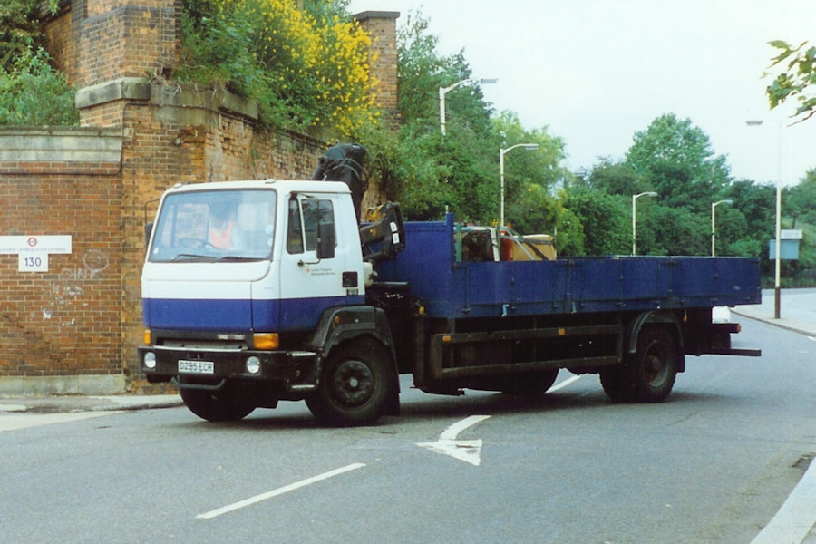 Details: Here is Leyland Freighter 2435L again, this time entering Acton Works in 1993. The lorry had by then been repainted into the white/blue livery, but what is slightly interesting is that the dropside body had originally been repainted black (see Colin's photo from February 1991). The strip under the windscreen was black on new Leyland T45s, it being designed by Ogle to give the impression that the windscreen was deeper than it actually was. Having said that, the panel was also used for the large Leyland lettering. On 2435L this had been repainted (or replaced) plain white, as also happened to 2372L and 2395L when they were repainted. Curiously, later 2464L managed to retain the black strip. 2435L remained in service until 1999 when it was sold and exported. |