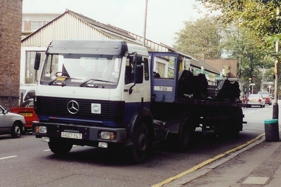 Details: After taking two batches of Mercedes 307D trucks in 1986, a pair of larger 814 lorries were added at the very end of 1987, followed by a couple of artic tractor units in 1988/1989. It was in 1990 that Mercedes became a major supplier to the central fleet, with 21 vehicles of varying sizes taken into stock. The first of these was 2474M, a 1726 artic tractor with the familiar SK-series cab and delivered in February. Although new, it arrived in a red livery rather than the standard grey, suggesting it may have been from dealer stock. The new LUL white/blue livery was introduced at about this time, and 2474M was soon repainted thus, with 'London Transport, Distribution Services' lettering. James caught it coming down Bollo Lane in Acton, showing traces of the former red livery underneath the radiator grille. I have included this photo mainly for the trailer, which is Boden 2-axle flatbed T59 acquired in 1994. This has not appeared on LTSV before, and it was disposed of in 2002 after a relatively short life. |