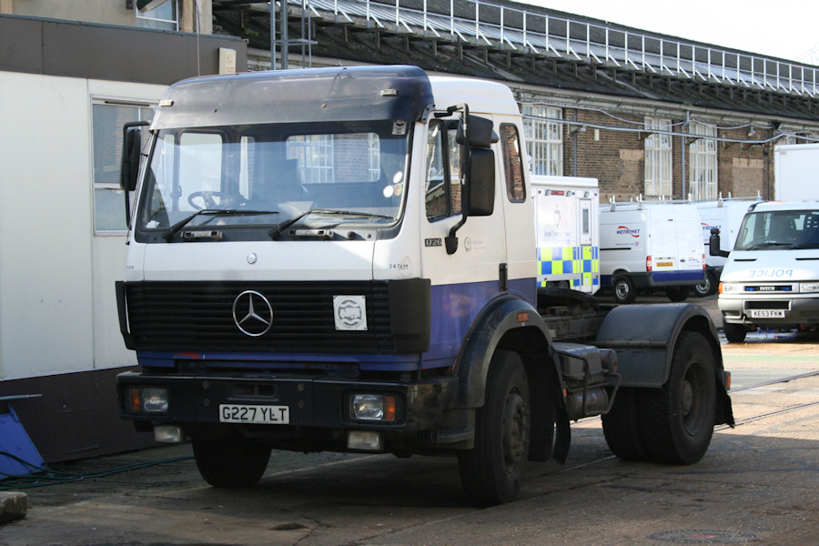 Details: One more photo of Mercedes 1726 artic tractor unit 2474M today, this one being taken at Acton Works on 6th March 2007, less than a year before the lorry was sold. The traces of the original red livery are still visible, as is the faded 'GLC exempt vehicle' label on the radiator grille. Come to think of it, the latter is a bit odd. The Greater London Council was abolished in 1986, yet 2474M was not delivered until 1990! Also visible are a pair of new Ford Transits for Metronet, and two British Transport Police vehicles. Leaning against the building on the left are some blue doors which are probably off a service vehicle, possibly being from the back of a dropside lorry. |