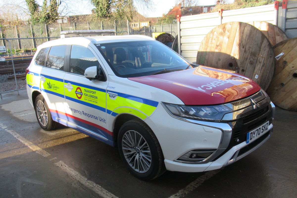 Details: The Mitsubishi Outlander car seen newly-delivered to Acton Works in October was soon given full LUL livery with emergency-style blue-edged yellow bands on the sides, and mirror writing on the bonnet. Assigned to the Emergency Response Unit and given the fleetnumber 9162MIT, it seems to be a belated replacement for Volvo car LM66UNH, withdrawn in March 2020. The role had been covered in the interim by Toyota Prius cars in standard LUL livery. 9162MIT was photographed near the back of Acton Works on 5th December 2020. |