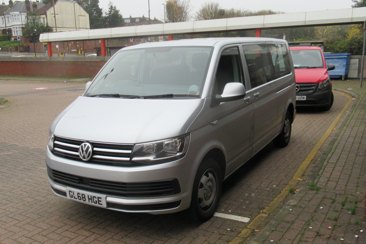 Details: This unmarked silver Volkswagen Transporter minibus seen at Eltham Bus Station on 30th November 2020 was initially thought to be an Arriva London vehicle, perhaps acquired as a replacement for recently-withdrawn CT68CKG. However, further observations have shown that it is in fact operated by Go-Ahead London from Orpington Garage. Given Go-Ahead's use of a large quantity of red Mercedes Vito minibuses (like RF19UZN parked behind), I suspect GL68HGE will be a temporary addition, perhaps to facilitate greater social distancing by limiting the amount of people on each crew ferry run. |