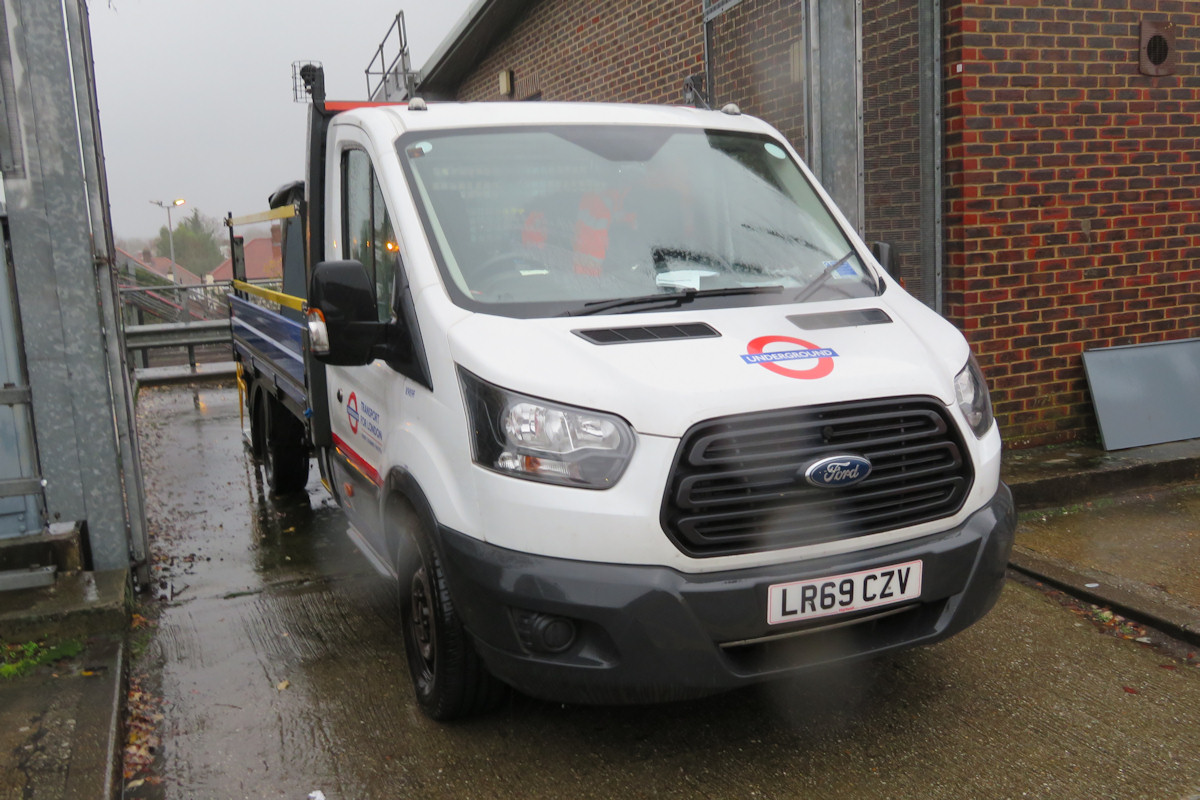 Details: LUL Power Supply Ford Transit dropside truck 8989F was photographed at Edgware on 19th December 2020. It was parked on a short alley off the ramp down to the bus garages (where 8853F was parked) that serves a building adjacent to the railway tracks. It is presumed that this is a substation or similar, and it is perhaps notable that there used to be another largish building on the opposite side of the ramp here that also looked to be related to electrical supply. The latter building (visible in the background here) has in recent years been demolished to make way for more bus parking space. |