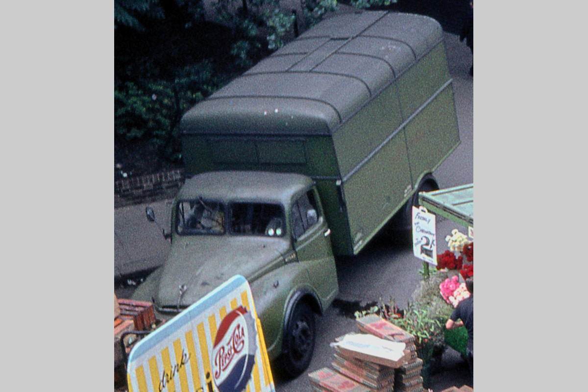 Details: From 9079VW in 2020 to 979AS in 2021, except of course that this photo was not taken in 2021! Evidently cropped from a larger photo, this was taken in July 1962 by the late Bill Taylor, and reached me via his son Bernard and Clive Greedus. It shows unique Austin BMC 'tin-front' van 979AS parked outside Embankment Station, as viewed from the Charing Cross bridge footways. The quality is not great but colour pictures from this era are always of interest. 979AS was new in 1957 and initially used by the Lifts and Escalators section before transferring to CDS Group 3 in 1960. Note the sliding hatch in the roof, presumably to allow long loads such as poles to be carried. There were also hatches in the front of the body for the same reason. Service vehicles were often to be seen parked at this location. There was a large substation (or similar) nearby, plus it seems to have been used by some drivers as a place to take a lunch break. Indeed one of the two other photos of 979AS on this website shows it at the same location. I would have liked to have seen more of the Pepsi-Cola truck in the foreground, while it is notable that there is still a flower stall nearby today. |
