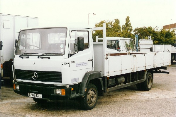Details: The first large Mercedes-Benz trucks to join the service vehicle fleet were a pair of 814 Dropsides bought in 1987. Both carried Grey livery and were allocated mainly to Chiswick and later Acton works. 2470M (E308GLO) was photographed at the former location on 13th August 1988. |