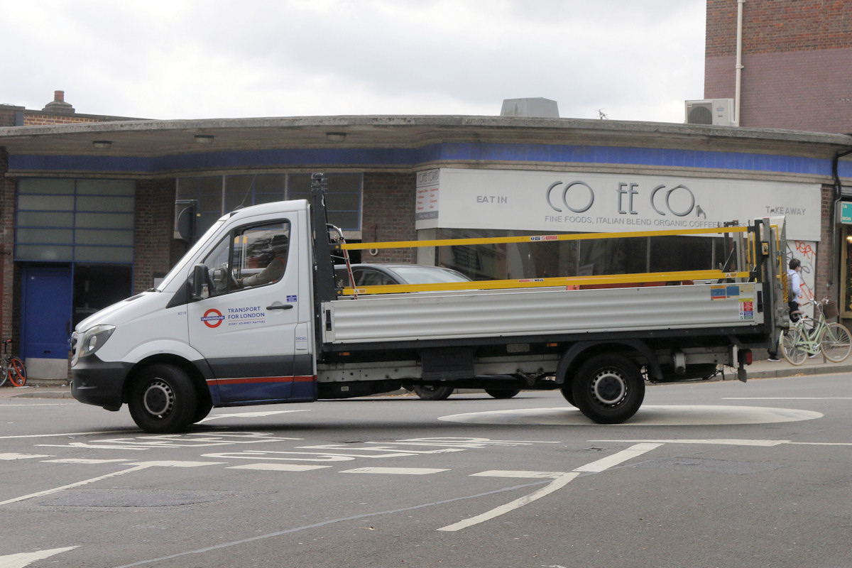 Details: I had speculated in the past that the reason a couple of Mercedes Sprinter dropside trucks had been added to the central fleet was because they offered a longer loadspace than the Ford Transit. However, there is a new version of the Transit dropside that is even longer, though none have yet been seen as service vehicles. This side-on shot of 8219M passing Acton Town Station on 11th October 2018 shows that the body is fairly long. It is also unusual for being unpainted metal rather than blue. |