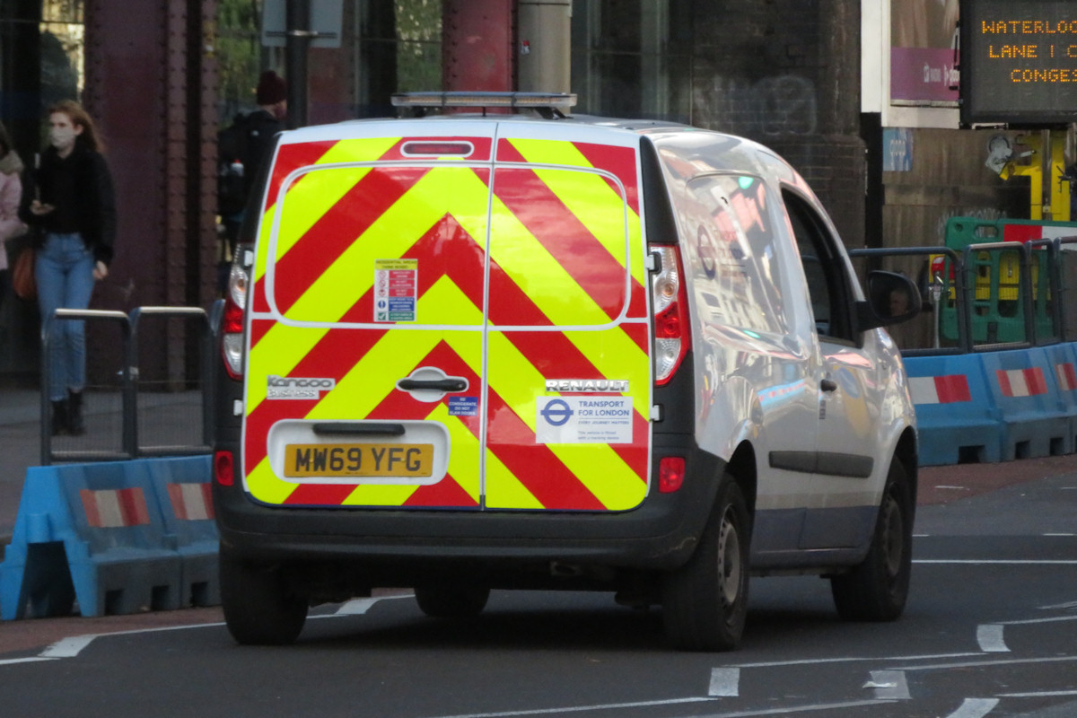 Details: Renault Kangoo van 9117R in generic TfL white/blue livery was caught passing Waterloo Station on 5th October 2020. This angle highlights the fact that this livery does in fact include a stripe above the blue skirt, this being reflective white. This van is believed to be used by TfL Streets from the nearby Chancel Street base. |
