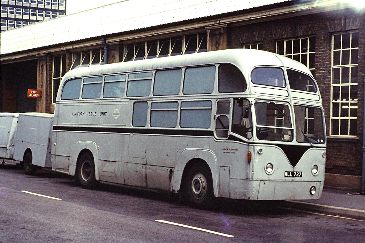 Details: Derek Everson has very kindly sent me thousands of photos over the past decade, including many from the 1980s and 1990s. He is now able to tap into even older parts of his collection, following the arrival of a slide scanner from Santa Claus. I am presenting a few of the results today but the photos are so good that I have decided to ration them to just a few in each bundle. That should see me through the rest of this lockdown, hopefully! First up is this view of AEC Regal IV uniform issue unit 1466W at Chiswick Works on 24th July 1973. Four such vehicles were converted from ex-BEA airport coaches in 1967 and remained in use until replaced by the Ford D box lorries in 1977. I was surprised to realise how few photos of these vehicles I had in my collection, which in fact only covered one of the four (1468W). Also visible in this view are two of the trailers used with the Regals. The fact that the two trailers appear to be different suggests that one is the unique Marshall trailer (UT1), while the other is one of the three built by BB Trailers (UT2-4). Note that the fleetnumber on 1466W, and the lettering on the trailers, is white. |
