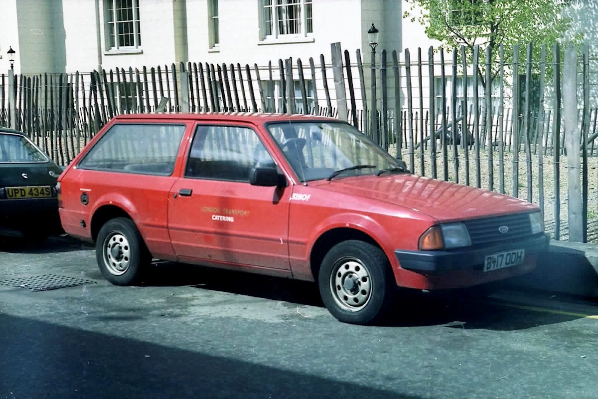 Details: The Ford Escort was the standard car in the London Transport service vehicle fleet for most of the 1970s and 1980s. Most of the examples taken were estates, with just a handful of saloons. Cars such as 3290F were referred to as estates, but they are perhaps more like modern hatchbacks than modern estates. There are no doors to access the rear seats, and the space behind is relatively short. 3290F was new in September 1984 for use by LT Catering and was allocated to Baker Street (Allsop Place). It was photographed there in May 1986. |