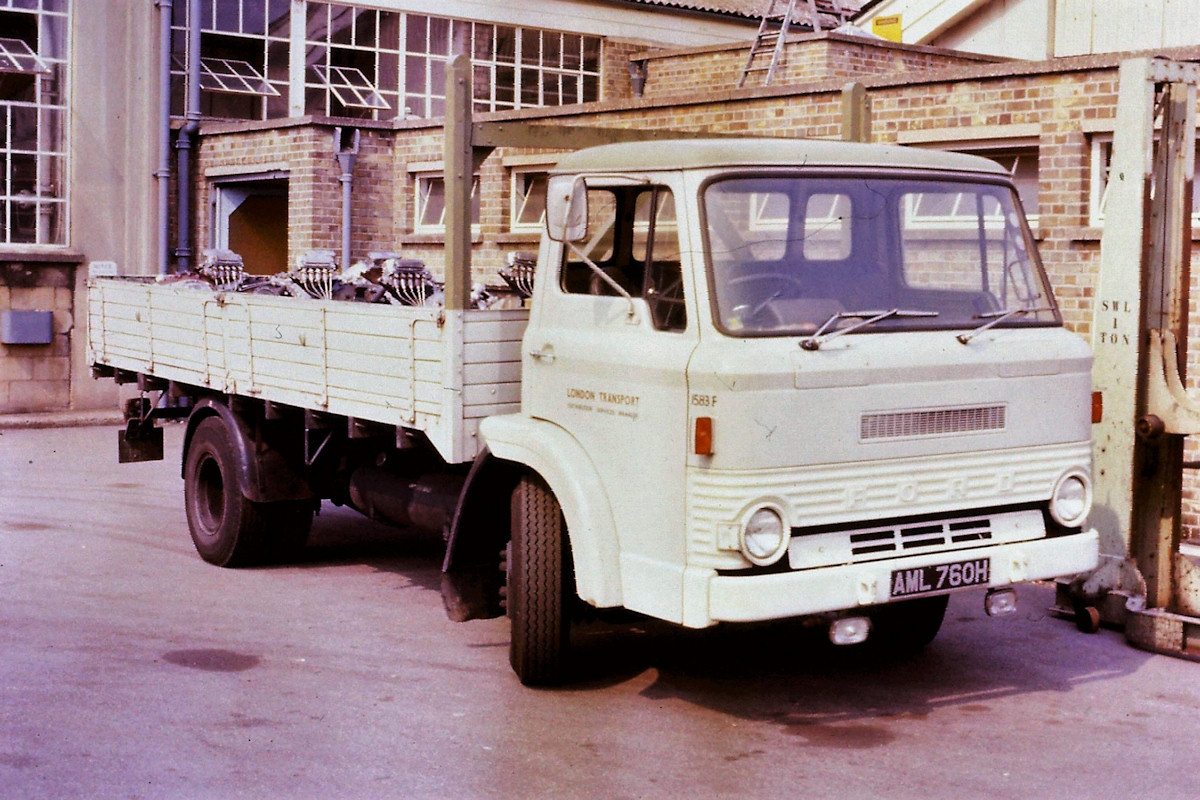 Details: The switch to a light grey livery for London Transport lorries was said to be due to Ford not being willing to supply vehicles in primer, nor in factory-finished 'Chiswick' green. For a time, lorries delivered in grey did have some green paint applied, but only to the cab roofs. The colour used is usually referred to as 'light green', though this view taken at Chiswick Works on 14th August 1975 makes me think that it was actually the traditional 'Chiswick' green. Note that on this lorry, the bolster has also been painted green. The FORD lettering on the front, which was normally black or unpainted metal, has been overpainted in white. 1583F was a Ford D550 dropside lorry new in February 1970 and based at Chiswick Works for most of its 12 years with LT. |