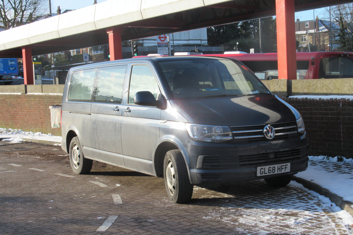 Details: Seen in the snow at Eltham Bus Station on 10th February 2021, VW Transporter minibus GL68HFF is most likely on hire to Go-Ahead London's Orpington garage, similar (but silver) GL68HGE having been noted here a couple of months earlier. |