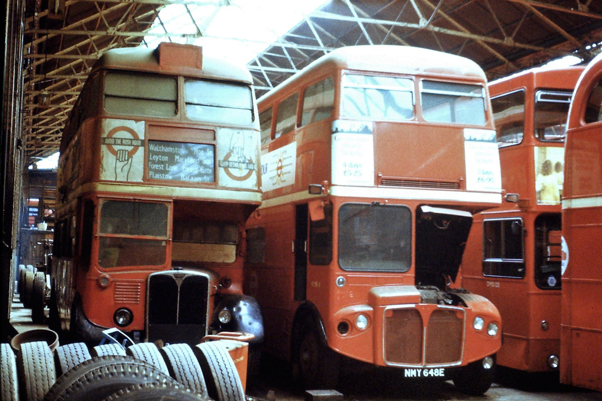Details: Part of the fun of getting to go around bus garages was finding unexpected vehicles lurking at the back. This photo taken in West Ham Garage on 12th June 1977 shows AEC Regent Instruction Bus 1037J parked beside staff bus RMA11. Starting with the latter, this was one of 65 AEC Routemasters built for services from central London to Heathrow Airport. They differed from normal Routemasters in having a foward entrance and staircase (note the plain panel behind the cab), and they lacked opening windscreens. Twin headlamps were fitted, as also seen on the Green Line Routemaster coaches. Following the ending of the airport coach service, all 65 buses were sold to London Transport. A handful were tried in passenger service, while a few were converted to trainers (which entailed the removal of the staircase so that the instructor could sit behind the driver). The majority were used as staff buses, running between Aldenham Works and various parts of London. The buses were kept near to their destinations and hence could be found at many different garages. After the closure of Aldenham (and Chiswick) Works, a couple of the RMAs passed to London Coaches, while at least one saw service with East London on routes 15 and X15. 1037J was famous for having the body originally fitted to RT1, the first of about 7,000 broadly-similar vehicles to be built for LT. It was taken into service vehicle stock as a mobile instruction bus in 1956 and it is not clear how long it remained in this role. It certainly appeared to be out of use when seen, and it was sold for preservation the following year. Note also what appears to be a couple of complete bus chassis behind 1037J, perhaps also originally used for training purposes. |