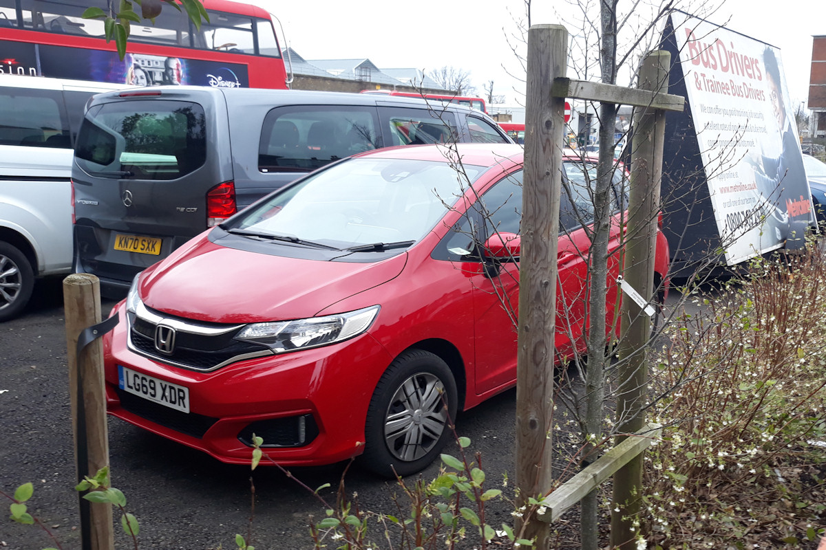 Details: While the supply of reports and photographs from many parts of London (most notably Acton Works) has dried-up due to travel restrictions, I am being kept abreast of developments at Potters Bar thanks to three local correspondents. The fleet of crew ferry vehicles at the Metroline garage has seen numerous changes, with several hired vehicles being used. First reported in late February 2021 were a pair of Honda Jazz cars. It would appear that these were acquired new in January 2020, perhaps as replacements for the Nissan Note cars. Found in the front car park at Potters Bar on 20th March 2021 was LG69ZDR. In unmarked red, it has been habitually coupled to a trailer bearing large bus driver recruitment advertising. The same trailer was in fact with the Nissan car in the photo linked above. Parked alongside was another recent addition, Mercedes-Benz Vito minibus KN70SXK in unmarked grey. This joined similar but black KN70SXP which had been in use since December 2020. |