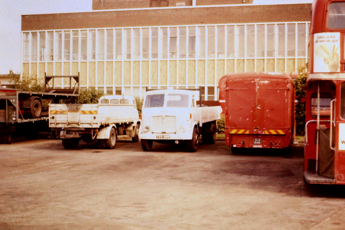 Details: Kicking off today's batch of photos is this very interesting view of Chiswick Works taken on 23rd August 1977. The location appears to be part of the front yard, with the Scientific Laboratory building in the background. There was a road circuit around this yard, used by trainee bus drivers (and to build up speed before hitting the skid pan). A bus on this circuit is visible behind the red lorry on the right. The service vehicles visible are mainly ones that would have been awaiting disposal. On the left are two single-axle trailers (one atop the other) still in old green livery. The lower one appears to be York YT7, which had been new as a dropside trailer in 1960 and which was sold in November 1977. YT6 was also sold on the same date, these being the last of the original batch of York trailers to go. It is therefore highly probable that YT6 is the trailer on top of YT7. Next to the trailers is a Ford Thames Trader towing lorry, recognisable by its fixed sides and the cut-out in the centre of the tailgate. Derek reports that this was 1309F, withdrawn from Upton Park in 1977 (following replacement by Ford D1110 1988F) but not sold until April 1979. Next in line is AEC Mercury 1071Q, one of three new in 1958 and which were fitted with an early form of tail-lift. Delivered in Chiswick Green with unpainted metal dropside bodies, 1070Q appears to have ended up in allover green while 1071Q and 1072Q were repainted in the 'new' grey livery. The bolster behind the cab is certainly a different colour, probably green. This has been seen on other vehicles, but usually in conjunction with a green cab roof, which does not seem to be present on 1071Q. 1071Q had been withdrawn in 1975 but was not sold until 1979. Curiously the other two Mercury lorries were both withdrawn in 1977 and sold within a few months. Finally we come to the big red box thing. This is Leyland Titan Breakdown Tender 1278LD and, according to official records, it was the only vehicle in the line-up that was still in use. New in 1964 as a railway breakdown tender, it was switched to a bus breakdown role in 1976, being based at Cricklewood (although some official documents show it as still being allocated to 'Rolling Stock Technical Officer (Railways)' at the time). It was to remain in use until 1983 (as the last of its kind) so the reason for it being in the Chiswick dump is not clear. Actually I can go a bit further with this photo. Just visible through the windows of the RT-type bus on the right is another red service vehicle. Although only a fragment is visible, I believe that this is AEC Mercury Tower Wagon 1077Q. The only tower wagon to be retained after the dismantling of the last trolleybus overhead wiring, 1077Q was used for other jobs requiring high level access. It was withdrawn in 1975 but (yet again) not sold until 1979. There is something red at the opposite edge of this photo (behind the trailers). This could be a shed or something, with a low angled roof. Or it could be one of the AEC Regent auxiliary breakdown tenders. 830J was still in use from Cricklewood Garage at this time, while Neasden's 832J was withdrawn in July 1977 so seems to be a more likely candidate. |