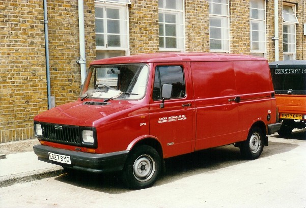 Details: Three Freight Rover Sherpa 200 Vans were leased in 1988 for use by the Cleaning Services department. 3573L (E827SYG) was one of these and it was caught on film at Chiswick Works on 13th August 1988. The vehicle behind is 3486P. |