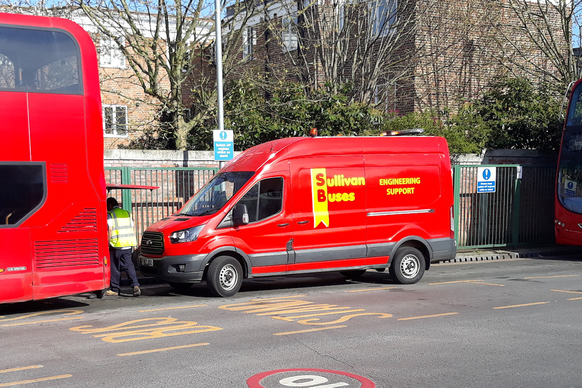 Details: Sullivan Buses pops up again. The small company recently added a newer Mk8 Ford Transit van for engineer's use, replacing Mk6 BT06JVG. The new van has been smartly marked-up and was seen attending to an Enviro 400 bus at Turnpike Lane Bus Station on 19th April 2021. |