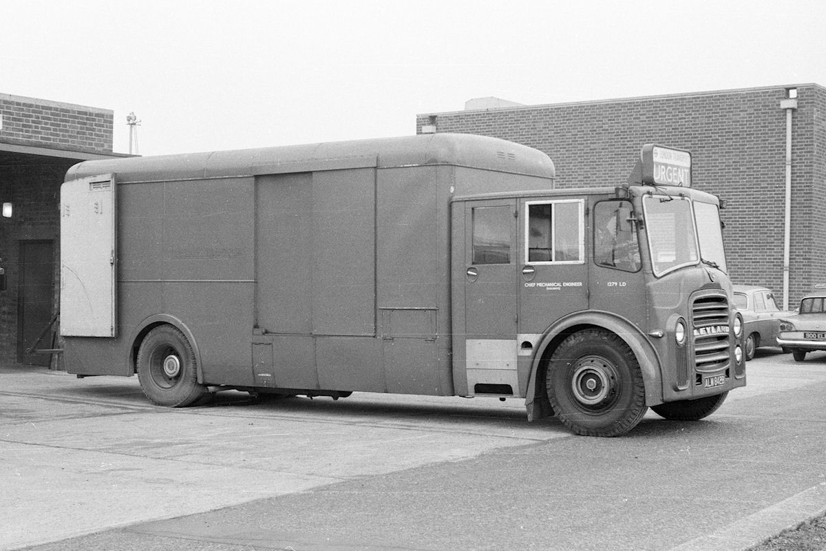 Details: I don't think anyone could call London Transport's eight Leyland Titan breakdown tenders attractive, although the later 1416LD was an improvement with its continuous roof-line. 1279LD seen at Neasden Depot on 14th March 1970 was one of the four allocated to the Rolling Stock Engineer, recognisable by the large sliding doors in the bodysides (which the Permanent Way vehicles lacked). There were in fact several other differences between the two sets of Titans. The bodywork on the RSE vehicles was about a foot taller, with a more pronounced curve into the roof. The cabs of the PWE vehicles (such as 1276LD) had a beading strip along the sides, round corners at the bottoms of the door windows, 2 foot steps below the crew-cab doors and none under the front doors, and there was a pronounced lip over the front windscreens. As seen above, the RSE vehicles had no cab-side beading, square corners all round on the door windows, a single large foot step under the crew-cab doors and an extra foot step under the front doors (both with kick-plates), and a smooth curve into the roof above the windscreens. 1279LD was withdrawn in 1980 following the delivery of new Ford D-series box trucks, though fortunately it survives in preservation. |