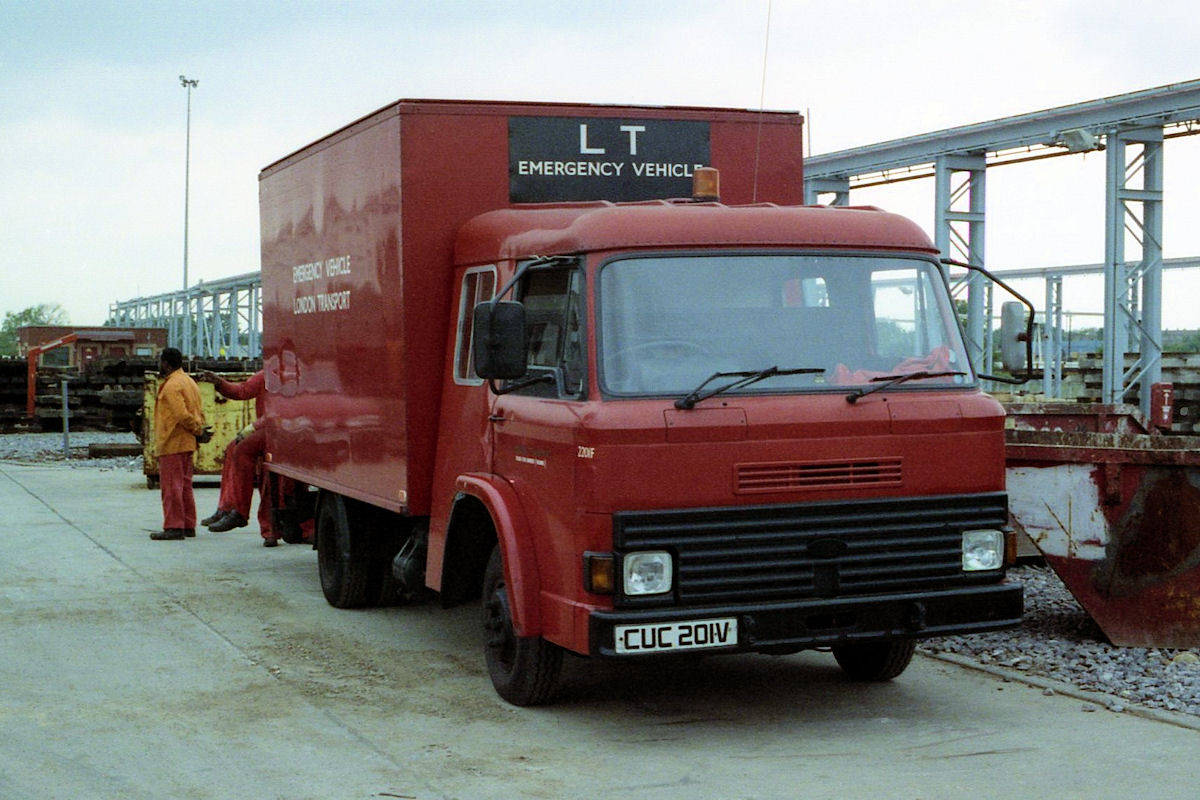 Details: The Leyland Titan breakdown tenders used by the Rolling Stock Engineer (such as 1279LD), were replaced by new Ford D0710 box trucks between 1976 and 1980. Last to arrive was 2201F in February 1980, later 2217F being for the Signal Engineer. Based at Neasden Depot, 2201F was photographed at Ruislip Depot in about 1989, the reason for its visit being shown in the next photo. The revised frontal design (with square headlamps in a black grille) was introduced in 1979 and thus only featured on the final 10 lorries bought by London Transport. |