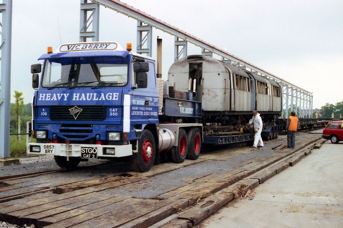 Details: This photo taken at Ruislip Depot in about 1989 shows a Foden tractor unit of Vic Berry being used to move a withdrawn 1962 stock tube car. The carriage was being taken to Heathrow Fire Station where it was to be used on fire-fighting and evacuation exercises. Vic Berry was based in Leicester and became famous for being the last destination of many BR locos and coaches, the firm being contracted to scrap numerous trains which had asbestos insulation. Note that railway sleepers have been used to provide a hard-standing at rail height, enabling the lorry to align itself with the track. Also visible is Ford Sierra estate car 3642F, used by the Neasden Depot Breakdown Foreman, while tender 2201F was also in attendance. |