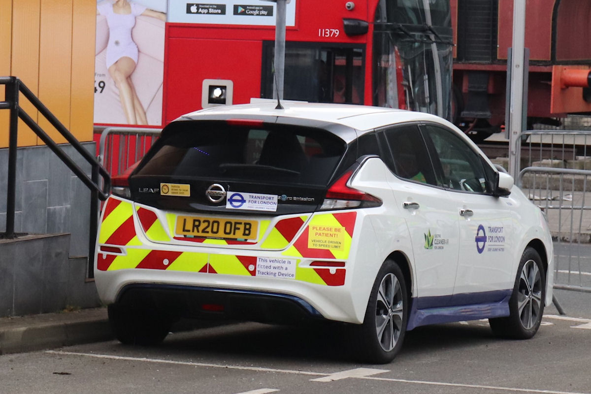 Details: Another Nissan Leaf rear-end, also taken by Derek on 6th May 2021. There are two reasons for showing this view of 9103N. Firstly, this car has recently moved from Turnpike Lane (where three of the four cars were initially based) to Stratford Bus Station. With most LBSL vehicles at Stratford now being kept at the City bus station, this is perhaps the first SV to be allocated to the 'old' bus station since the departure of the infrastructure vans about three years ago. The second point is that 9103N has gained two additional rear labels, both of which refer to the fact that the vehicle is driven to the speed limit. This seems odd. Firstly, why have two different labels? Secondly, why promote the fact that you are not breaking the law? |