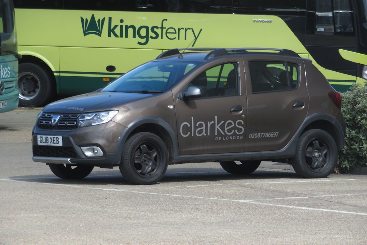 Details: Photos of service vehicles belonging to coach companies in London (and beyond) are occasionally shown on LTSV, though the vehicles are not listed in the database. A nice example is this photo taken in Sydenham on 5th April 2021. Clarkes is one of the longer-established coach operators in London and has always had a sizeable fleet of quite modern coaches. They were bought out by the National Express group in December 2016 though they have so far retained the Clarkes name and livery. One result of the take-over is the appearance of Kingsferry coaches at the Clarkes base. This is another long-established company, running commuter services between Kent and London from the early 1980s, originally using exotic (at the time) Berkhof coaches. Kingsferry was based in Gillingham and took its name from the nearby bridge that provided the link to the Isle of Sheppey. The company was taken over by National Express in November 2007. Both operators use shades of green (and have the modern aversion to capital letters!), with a green Clarkes Mercedes Tourismo peeking in from the left, and a Chinese-built Yutong coach of Kingsferry in the background. What about the service vehicle though? GL18XEB is a Dacia Sandero Stepway car in a sort of metallic brown livery. The Stepway version of the Sandero is marketed as a 'Crossover' or 'semi-SUV'. In reality, it is the same as the normal Sandero (as seen with RATP MJ69ZKV) apart from having raised suspension, roof bars, black plastic panels along the skirt and wheelarches and a slightly revised front grille and bumper. |