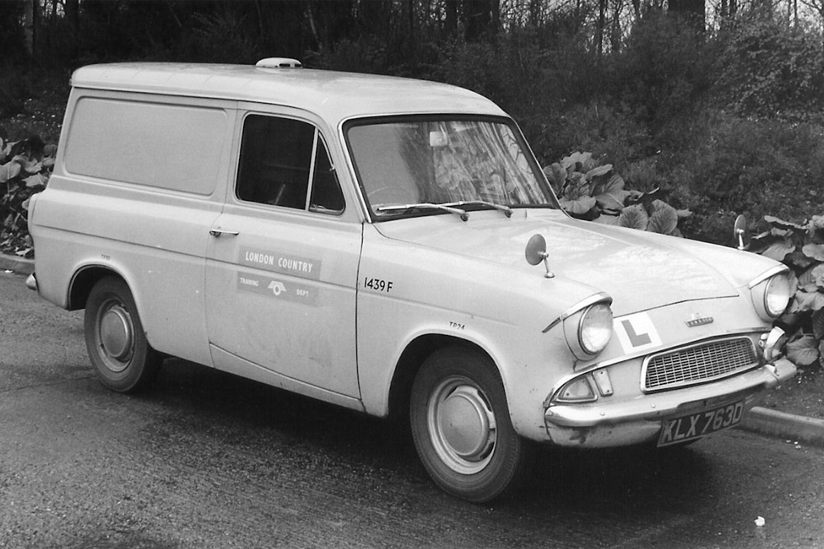 Details: London Transport used about 70 examples of the van version of the Ford Anglia car, although the Anglia name was not generally applied to these. Most of the vans were withdrawn by the early 1970s and photographs of the type are quite rare. This well-known example shows a curiosity, 1439F being one of three vans loaned to the recently-formed London Country Bus Services in spring 1971. Two of the vans were returned after a couple of months but 1439F appears to have stayed for just over a year. Officially allocated to Reigate Garage, the van was photographed at Stevenage Garage on 20th February 1971, just three days after the loan began. It had already gained a 'London Country, Training Dept.' label on the doors and L plates. Having been assigned to the Mains Engineer before the loan, it was destined not to see any more use after its return, and was sold in September 1972. |
