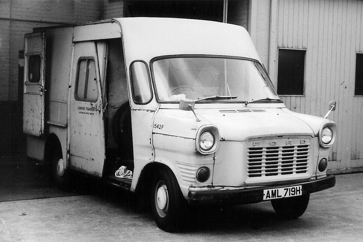 Details: The other early long-wheelbase Ford Transit was 1542F, which was a very different-looking machine. Julian photographed it at the ticket machine works in Effra Road (Brixton) on 15th April 1977. As can be seen, it had the bonnet and windscreen of the standard Mk1 Transit, but everything beyond that appears to be coach-built. There are additional quarterlight windows, sliding cab doors that are taller and flatter than those on the standard van, and a rather slab-sided body with hinged doors in the rear. It appears that the body is of the 'walk-through' type, whereby there is access into the load-space from the cab. It could be called a 'laundry' body, or it could be an early design of what became the 'parcels' body (as seen on 1718F). Interestingly, Effra Road was allocated a parcels Transit from 1971, and also had another long-wheelbase van from 1977 (2024F, whose configuration is not known). 1542F was withdrawn in 1978, seemingly replaced by Bedford CF van 2117B. Note that this photo was taken while the van was in a covered loading bay. If anyone has any photos that show the buildings at Effra Road I would be very interested to see them. |