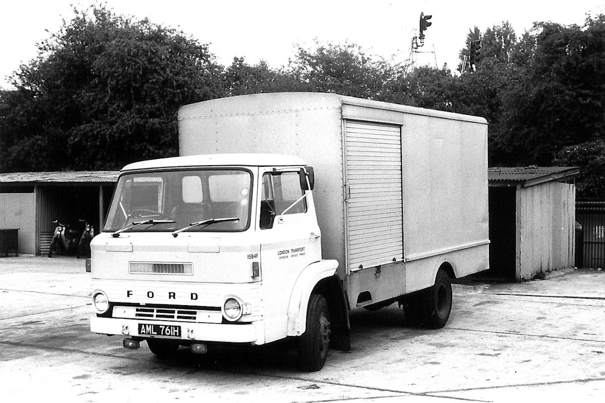 Details: It seems slightly odd looking back but London Transport had quite a large catering section, with a food production centre in Croydon and a fleet of vehicles to take the goods out to the numerous staff canteens at bus garages, works and some stations. In the 1970s, most of these vehicles were Ford D-series lorries with box bodies and roller-shutter doors. They could be readily distinguished from more general-purpose box trucks because the bodywork was normally left in an unpainted metal finish. Showing both features when photographed in the CDS yard at Chiswick Works was 1584F, a D500 5-ton lorry new in May 1970. The appearance of these vehicles at Chiswick was slightly unusual as they were allocated to Croydon FPC and were normally docked (maintained) at the nearby Thornton Heath Bus Garage. However, official documents show that this example was transferred to Chiswick sometime between 1974 and 1978. |
