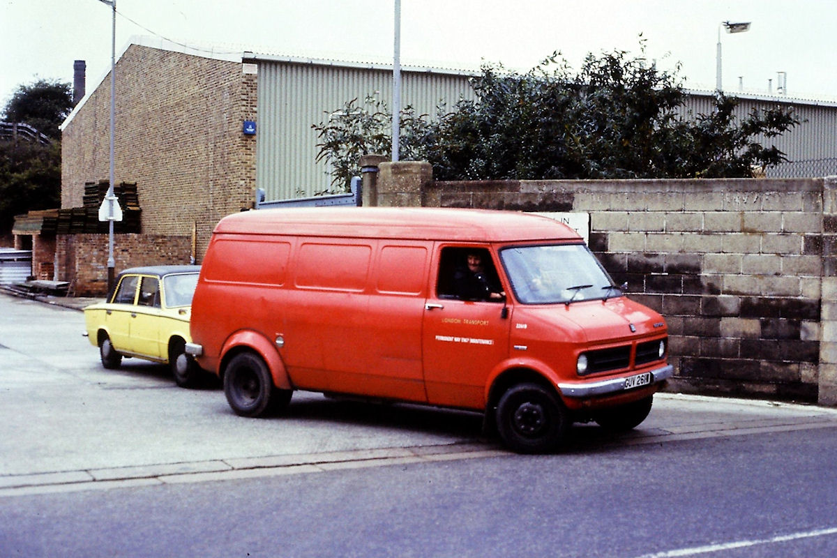 Details: For a while the Bedford CF model was popular with London Transport as an alternative to the similarly-sized Ford Transit. A total of 91 were bought or leased between 1977 and 1987, the vast majority of which were short-wheelbase vans. There were five dropside trucks (of which at least three were long-wheelbase), but there appears to have only ever been one long-wheelbase van. This was 2261B, new in August 1980 and caught leaving the rear entrance of Chiswick Works on 8th October 1981. As with the Transit, the long-wheelbase Bedford CF van was quite curvaceous, with an almost domed roof profile and more prominent rear wheelarches. The van had a hinged cargo door in the nearside and most likely had twin hinged doors in the rear. As can be seen, 2261B was allocated to the Permanent Way Engineer and was based at Acton and Ruislip at times until it withdrawn in 1984, replaced by leased LWB Transit 3199F. Note the car (presumably privately owned) following behind. Was it just mis-management and trade unions that wrecked the UK motor industry or did the naff colour options play a part?! |