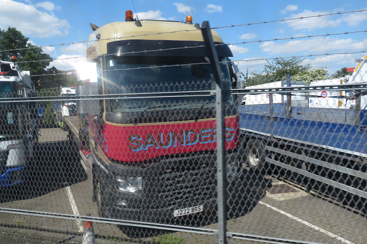 Details: An interesting vehicle seen during a 'flypast' of the lorry yard at Acton Works on 5th June 2021 was this Renault C380 3-axle flatbed lorry in the brown and red livery of B R Saunders of Walton-on-Thames. The lorry had a large folding crane behind the cab and (although obscured by the chromed mirrors in this view) had TfL/LUL labels applied to the doors. The registration is of course a 'select' one, and disguises the fact that this lorry was new in 2015. Other service vehicles visible include dustcart WO66HHS on the left, demountable body DB10 and Scania tipper MV69KVM behind, one of the MAN dropside lorries on the right and VW Crafter box van 8833VW and more dustcarts behind that. |