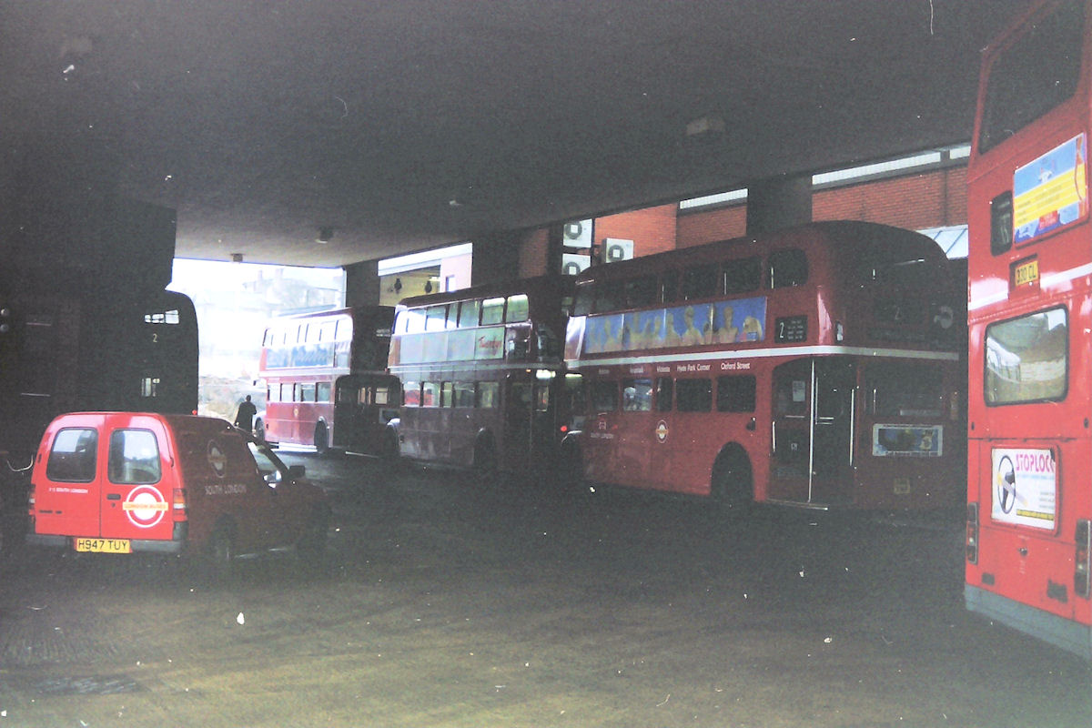 Details: Interest in service vehicles probably reached its nadir in the 1980s and 1990s, with only a handful of individuals still photographing and tracking them. Fortunately, service vehicles do often appear as peripheral content in other photographs, such as this view of the covered forecourt of Norwood Garage taken by Phil Eames in about January 1994. On the left is Ford Escort van 4055F, new in May 1991. The livery of this van is slightly puzzling. As seen in Colin's photo taken the month it was delivered, the van had fleetnumbers and a large London Buses roundel on the offside at least. However, another photo from July 1992 showed it having a completely unmarked nearside. Phil's photo shows the offside and rear, both of which have roundels. The fleetname of South London has also been added, along with that well-known South London landmark of Tower Bridge! Other points to note are that the L-class Olympian on the right carries the registration number from Routemaster RM1330, while the nearest RML has via points for route 2 applied along the cantrail panels. The route 2 has been associated with Norwood garage seemingly forever, and it still covers the core section between Norwood and central London. |