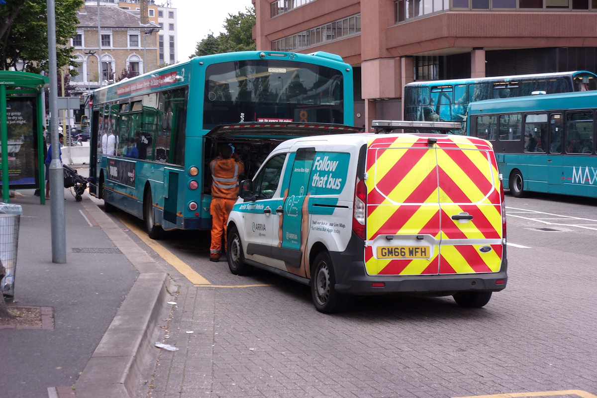 Details: A large batch of Ford Transit Connect Mk2 vans was acquired by Arriva Southern Counties in spring 2017, of which 5 are based at garages covered by LTSV. The vans are used by bus engineers and carry a white-based livery with large vinyls advertising aspects of Arriva's service or recruitment. GM66WFH is allocated to Hemel Hempstead, is officially numbered V078 and advertises the Arriva bus app. It was seen at Watford Junction on 16th August 2021 attending to a mechanical issue on a Wright-bodied single-decker. Strangely it does look like people are still getting on the bus. On the right is another Arriva single-decker but in the 'Max' livery variant, while behind that is a double-decker liveried for the service to the 'Making of Harry Potter' exhibition at the film studios in nearby Leavesden. |
