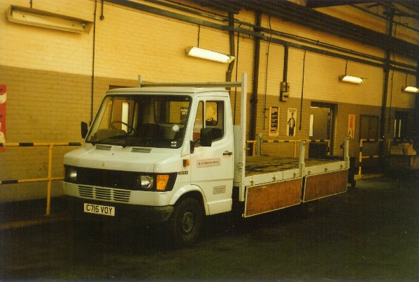 Details: The first Mercedes-Benz vehicles in the service vehicle fleet were two batches of 307D trucks bought in 1986 and finished either as curtain-siders or drop-sides. 2427M (C715VOY) was one of the latter although it did not carry its fleetnumber when photographed at Enfield Garage on 6th August 1988. |