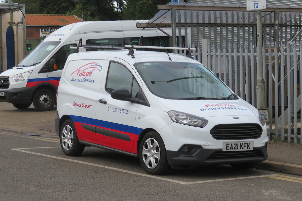 Details: The first new (as opposed to second-hand) service vehicle for the Falcon Buses fleet was Ford Transit Courier van EA21KFK, seen outside the Byfleet garage on 11th September 2021. Falcon operates both buses and coaches, with suitably suffixed fleetnames. While the Vauxhall Corsa van shown earlier carried 'Falcon Buses' fleetnames (and was used for bus crew ferry work), the new van has 'Falcon Buses and Coaches', as it provides engineering support to both operations. The 'Falcon Coaches' name can be seen on the Ford Transit minibus in the background. |