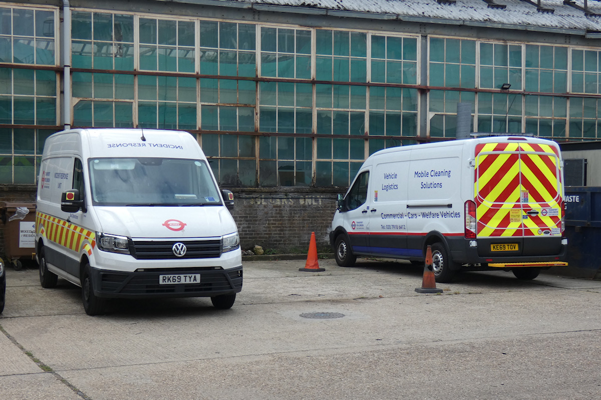 Details: Several London Buses service vehicles have been based at Acton Works in recent years, and they are usually parked in the area between the van yard and the works traverser. Also kept here is the LUL vehicle cleaning van. This photo taken on 11th September 2021 shows LBSL VW Crafter van 9081VW parked with LUL 9141F. Note that the latter has rear chevrons, while the van which it replaced (6527F) did not. Also of interest is the 'Pool Cars Only' lettering painted on the wall, this presumably being quite old. The building in the background is long and thin, with the BR tracks behind it, and its current use is not known. A large metal shed occupied the area to the right of this photo until a couple of years ago, and has now been replaced by a smaller 'Portacabin' structure. |