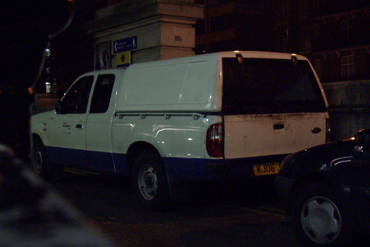 Details: 5953F was different from most Ford Ranger service vehicles. It had a 'super-cab', with additional seats and side windows but no access doors (later 'super-cab' Rangers had rear-hinged access doors for the second row of seats). More noticeably, it lacked the pronounced wheelarch fittings and appeared to have reduced ground clearance. This suggests that it was a 2-wheel drive variant, although these were not normally available with the crew-cab option. 5953F was found parked outside Baker Street Station on the night of 6th December 2006. There are no photographs for evidence but it is probable that 5958F was also to this configuration. |