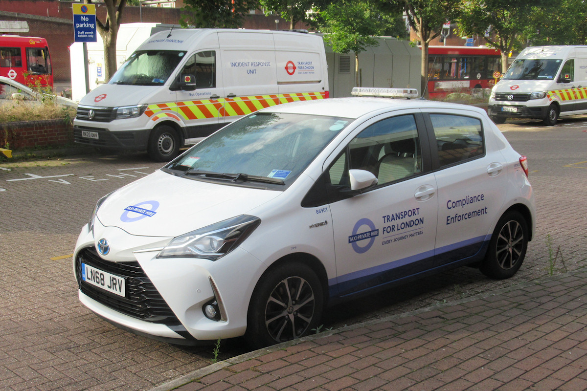 Details: TfL Taxi-Private Hire Compliance Enforcement car 8690T is a Toyota Yaris that was first allocated to Eltham Bus Station in September 2018. It was a fairly regular sight there until 2020, when it was re-allocated, perhaps as a result of the COVID pandemic. It has been back a couple of times, the most recent being when it was photographed on 17th September 2021. In the background are several of the VW Crafter vans which form the bulk of the allocation here. |