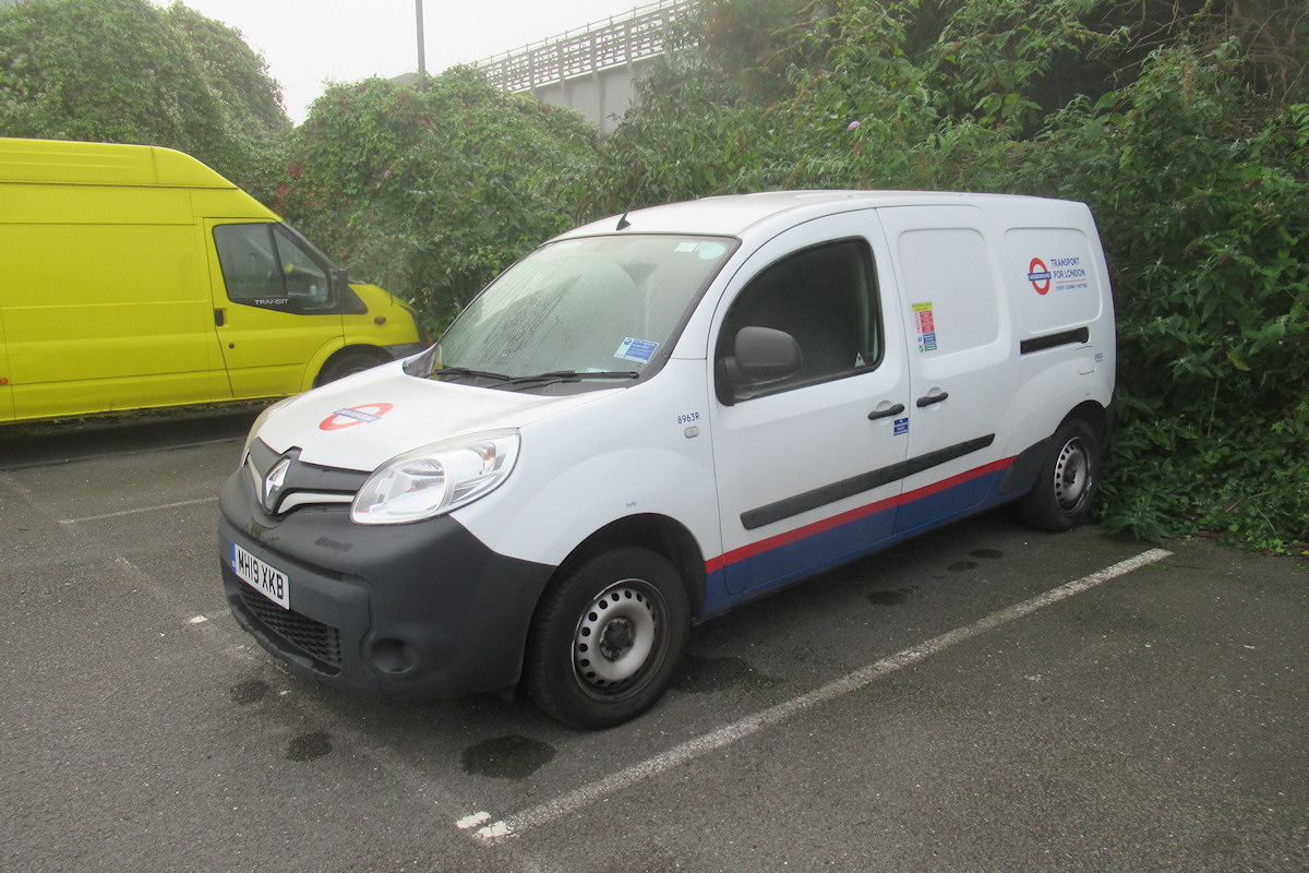 Details: A third LUL Renault Kangoo Maxi van in the Acton Works car park on 9th October 2021 also proved to be a rare one. 8963R was new in July 2019 but had only accrued a couple of night-time sightings, both at Lillie Bridge. Rather obviously, the yellow Ford Transit Mk7 in the background was not a service vehicle. |